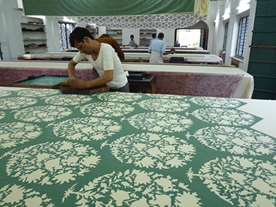 Brigitte Singh’s textiles are widely recognised as being amongst the finest block prints in the world. She is renowned for the unsurpassed quality and attention to detail she brings to her traditionally hand printed Indian textiles. The prints are both inspired by and taken directly from archive representations of the stylised motifs from the 17th to 19th Centuries of the Mughal Empire. Brigitte Singh became fascinated by Indian chintzes and their influence on 17th Century French Provencal prints when she travelled to Jaipur as a Parisian fine art student in 1980 to study Indian miniature painting under the Kumar Sangram Singh, a distinguished scholar and collector. Her interest in textile design led to the opening of her studio in 1984 to create designs using forgotten Indian motifs, striving to achieve the high quality of the 18th Century ateliers. The fabrics are created by traditional block print methods using a master printer who supervises a team of block printers. A 40 foot length of fabric can take up to a day to produce. It is a highly skilled process with separate blocks being used for each different colour, the correct positioning of the block being judged by eye. The blocks are frequently recarved as splitting or deterioration occurs over time. Brigitte Singh uses this necessary recarving process to her advantage by constantly updating older prints with new configurations, keeping her collections inspirational and fresh.